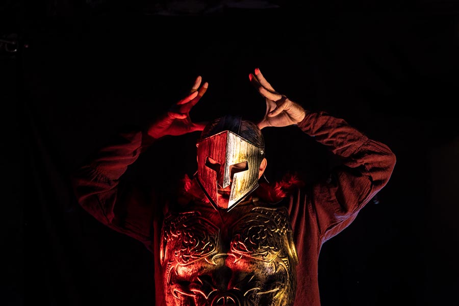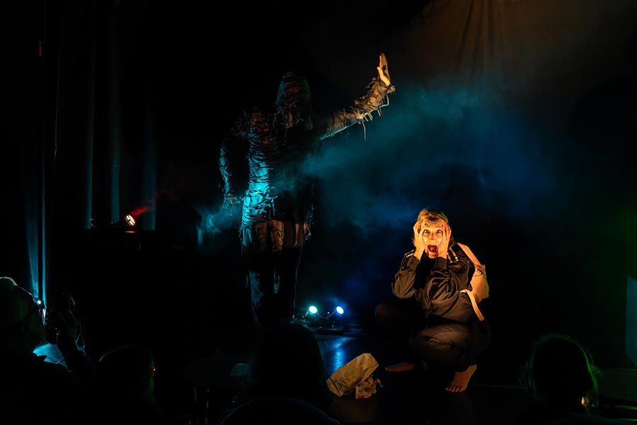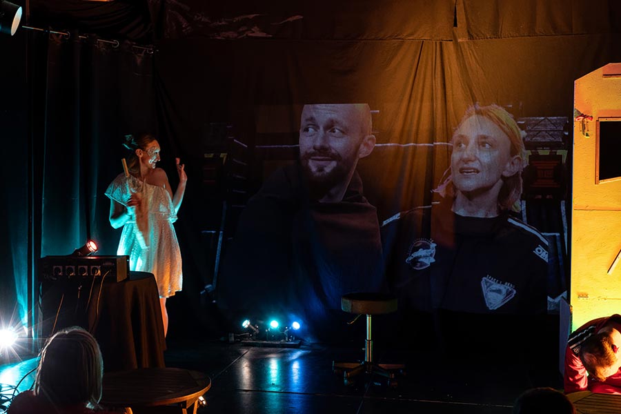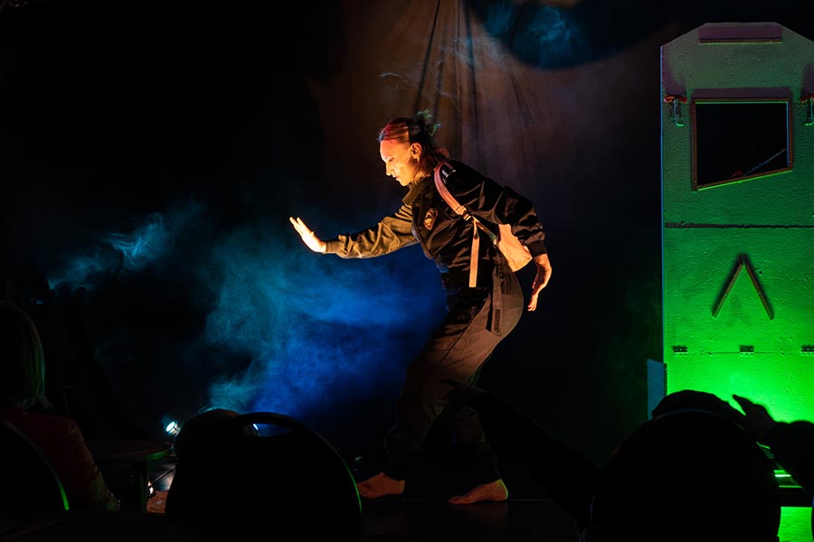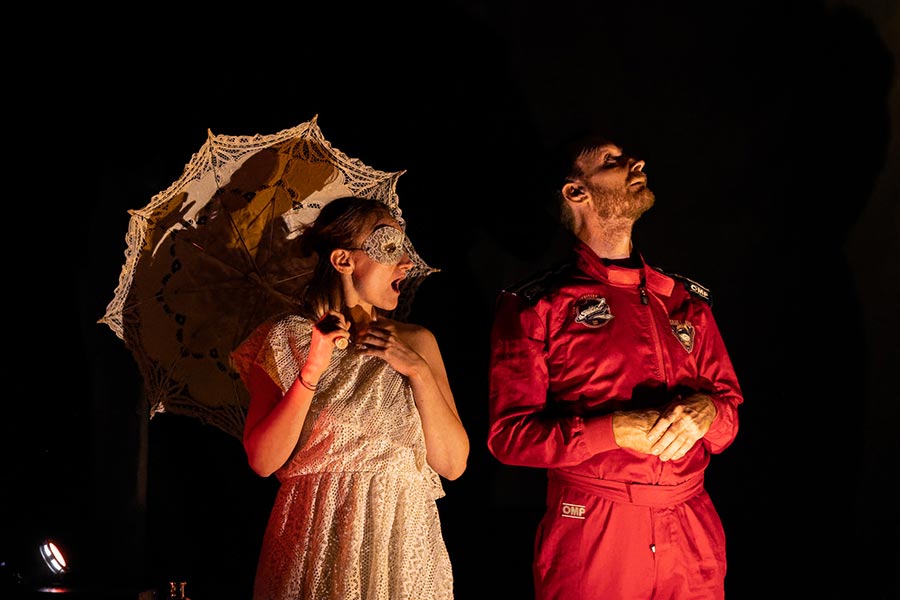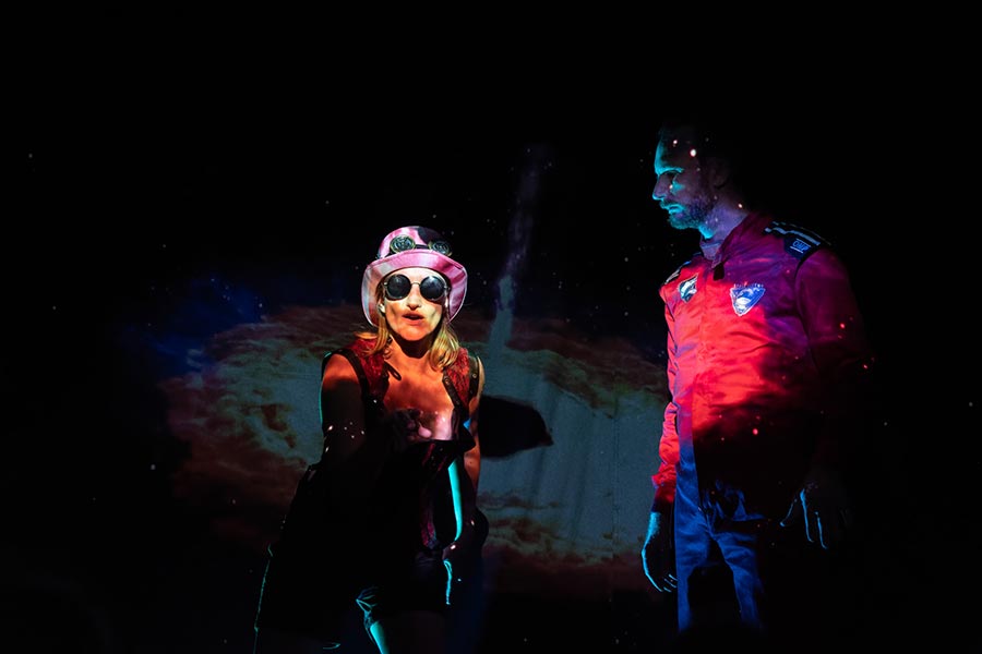 La mise en scène s’appuie sur une approche visuelle forte : les planètes deviennent des personnages à part entière, dotés de costumes et de personnalités bien distinctes, permettant aux spectateurs d’en saisir les caractéristiques en un instant. Pour donner vie à cet univers spatial, nous avons opté pour une mise en scène dynamique : les lumières sont manipulées en direct par les comédiens, créant des atmosphères changeantes qui évoquent tantôt l’immensité glacée de l’espace, tantôt la chaleur brûlante des étoiles. Cela permet de transformer l’espace à vue et de recréer l’immensité du cosmos tout en conservant une esthétique épurée.